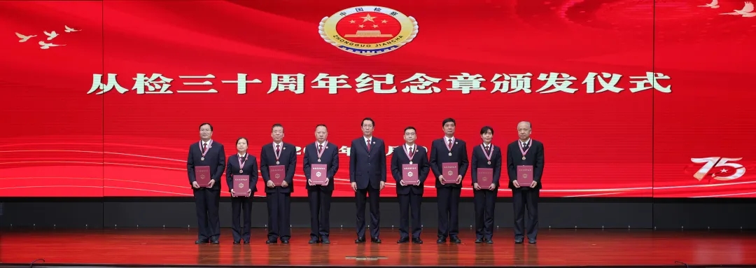 在纪念章颁奖环节,8位从检满30年的干警在掌声中登上舞台,段文龙检察长为他们颁发纪念章。随后,3名青年检察干警分享了自己与检察工作的点滴故事。
