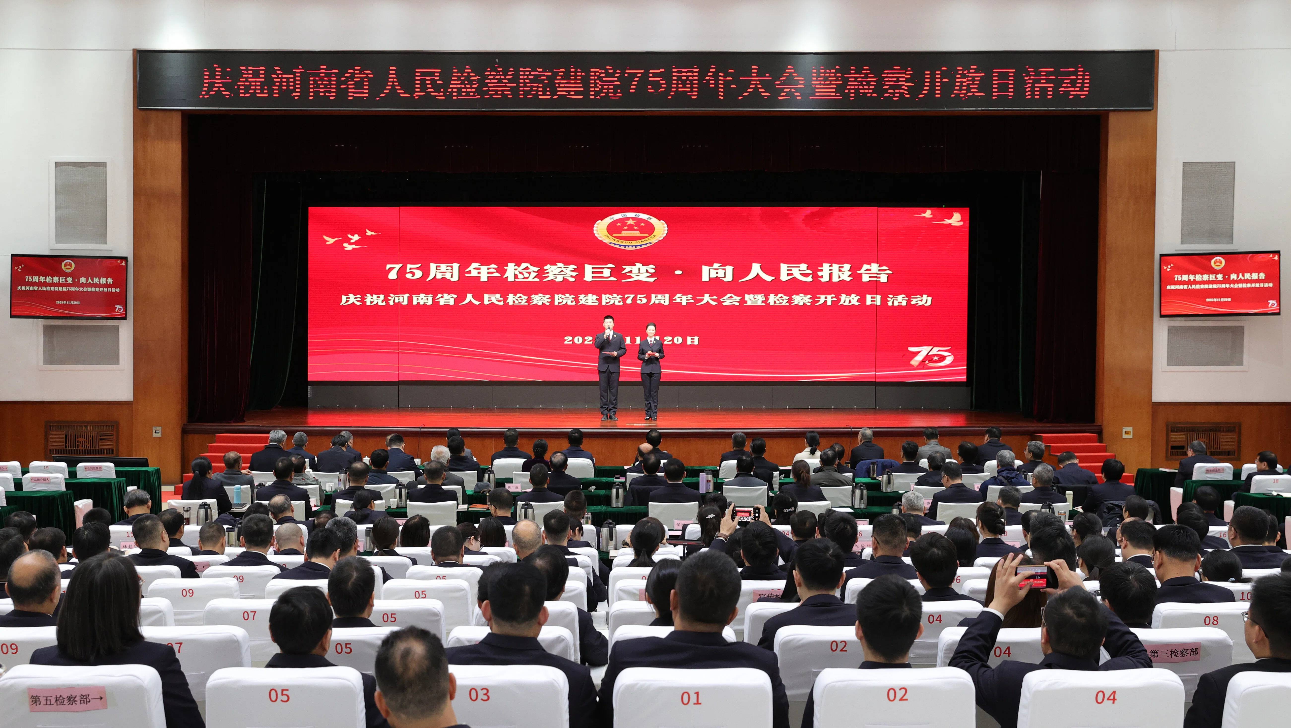 上午9时,庆祝大会随着《河南检察75年发展之路》纪实专题片的播放拉开帷幕。光影流转中,河南省检察院75年的辉煌历程在荧幕中徐徐展开,每一帧画面都镌刻着一代代河南检察人初心如磐的使命担当。随后,“豫重不同”“豫益美好”“豫见未来”“豫检枫尚”四个特色检察品牌依次亮相,从不同角度展示了河南检察机关在打击重大刑事犯罪、守护社会公益、呵护未成年人成长、化解矛盾纠纷等方面的成效和亮点。